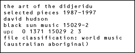 the projectWith the unprecedented interest in Australian Aboriginal culture and art, the ancient Northern Australian wind instrumentthe didjeriduhas experienced an astonishing popularity and ever growing interest in the West. Whether it's the sought-after sounds and rhythms akin to nature or the varied interest in Aboriginal culture, the didjeridu speaks with an unforgettable primordial voice to all who hear it. With the vast array of intricate rhythms and otherworldly tone colors, the elaborate improvisations that result strike a deeply buried chord in the mysteries of creation which seems to resonate at the core of humankind.Produced by longtime collaborator and producer Steve Roach, The Art of the Didjeridu is a collection of timeless pieces spanning a decade in David Hudson's professional career. It features deeply rooted and rich Aboriginal traditions as well as innovative contemporary styles and compositions. The priceless contribution Hudson has made to the art of the didjeridu is the infinite musically creative possibilities of a traditionally one note ancient instrument. the artistAustralian Aboriginal artist David Hudson is a world-renowned pioneer in the art of the didjeridu. A member of the Tjapukai tribe in Kuranda, North Queensland, he mastered the didjeridu and interpretive dances of his tribe at an early age. Armed with a profound understanding of the didjeridu, he possesses an exceptional talent of spontaneously creating/ performing multi-leveled compositions, as evidenced in his first solo recording, the highly acclaimed Woolunda: Ten Solos for Didgeridoo (13071-2). It is regarded by many experts as a ground-breaking experiment in the creative possibilities of the didjeridu.Known primarily for his traditional styles and use of the traditional technique of circular breathing, Hudson is credited for taking the art form to a new level through an innovative combination of extended techniques and modern compositional ideas. So much so, his inventive use of voice, space and explosive blasts of sound have more in common with 20th century avant-garde music than ancestral Aboriginal music. Hudson is co-founder of the Tjapukai Dance Company which, over the past decade, have become one of Australia's premier Aboriginal tourist attractions. Based outside of Cairns the group started offering short performances, expanded into a purpose-built theater and currently have developed Australia's first Aboriginal theme park. biographydiscographytracklist